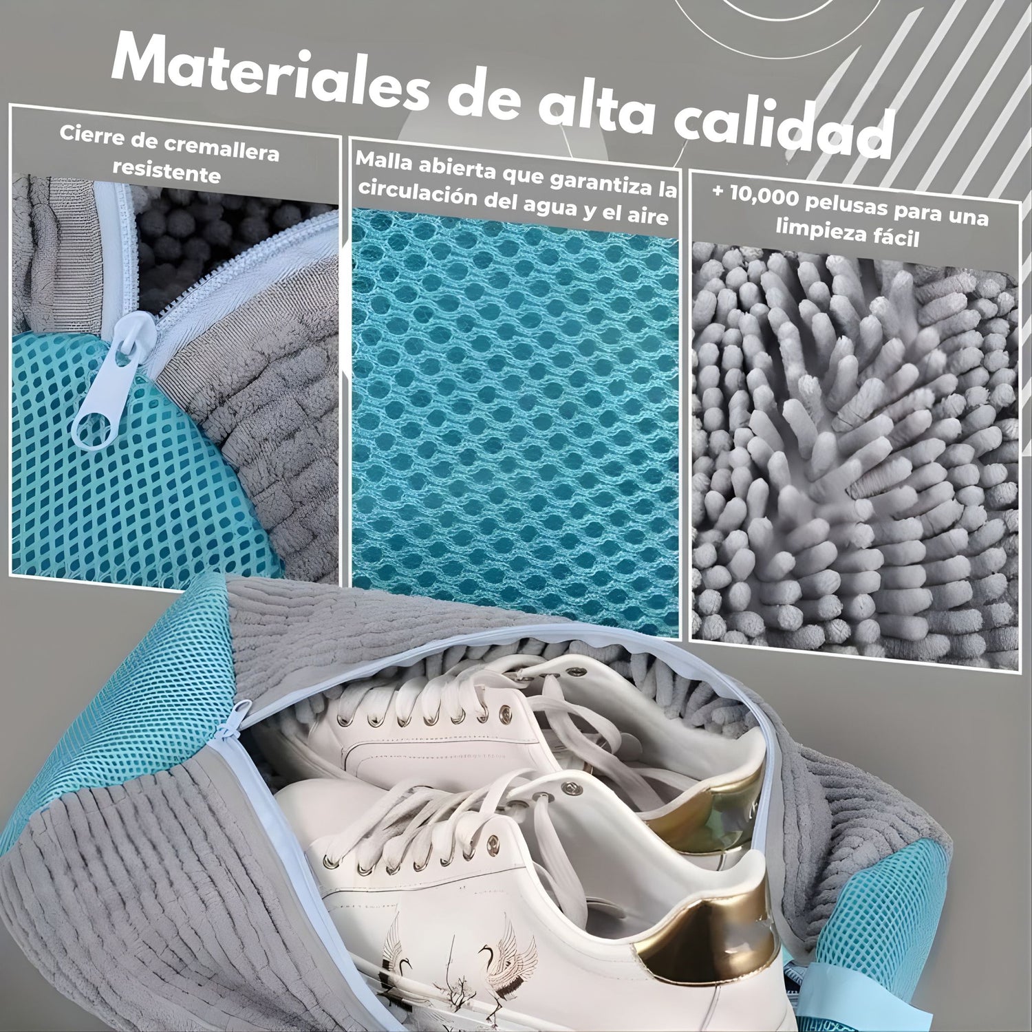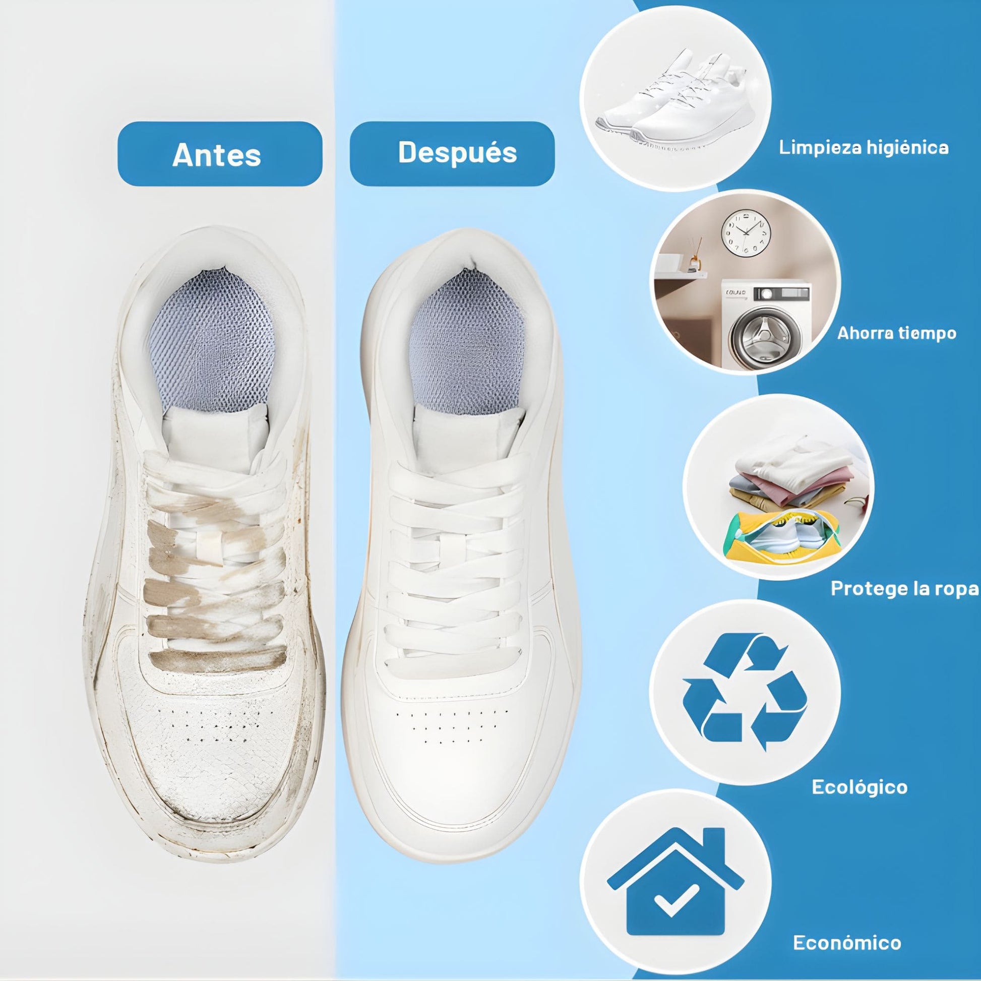 Ahorro de tiempo al eliminar el lavado manual, limpieza profunda sin esfuerzo, protección total de la forma y los colores, reducción de malos olores, mayor durabilidad de tus zapatos, uso seguro en lavadora y secadora, material resistente y reutilizable, y la tranquilidad de saber que tus zapatos quedan limpios sin dañarse.