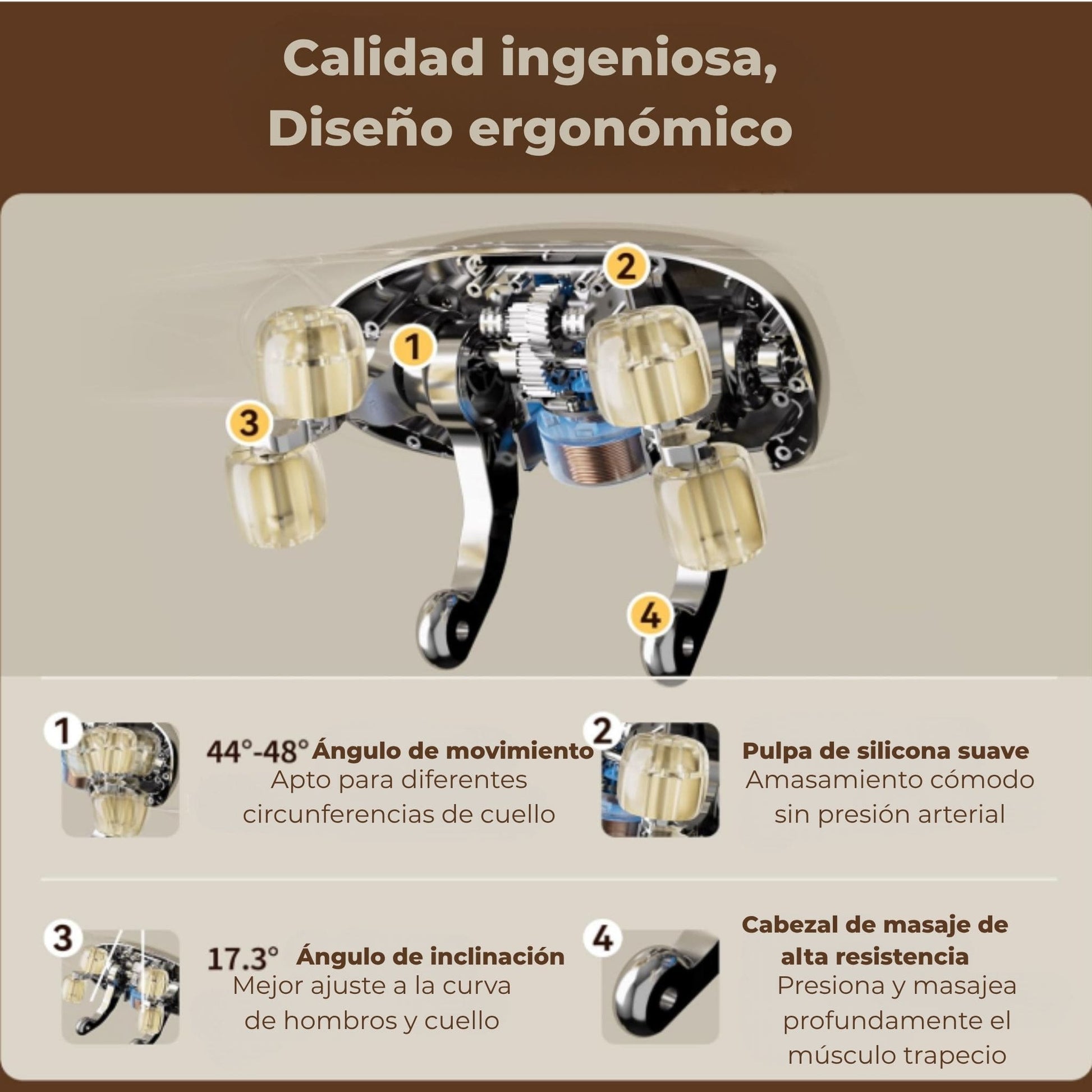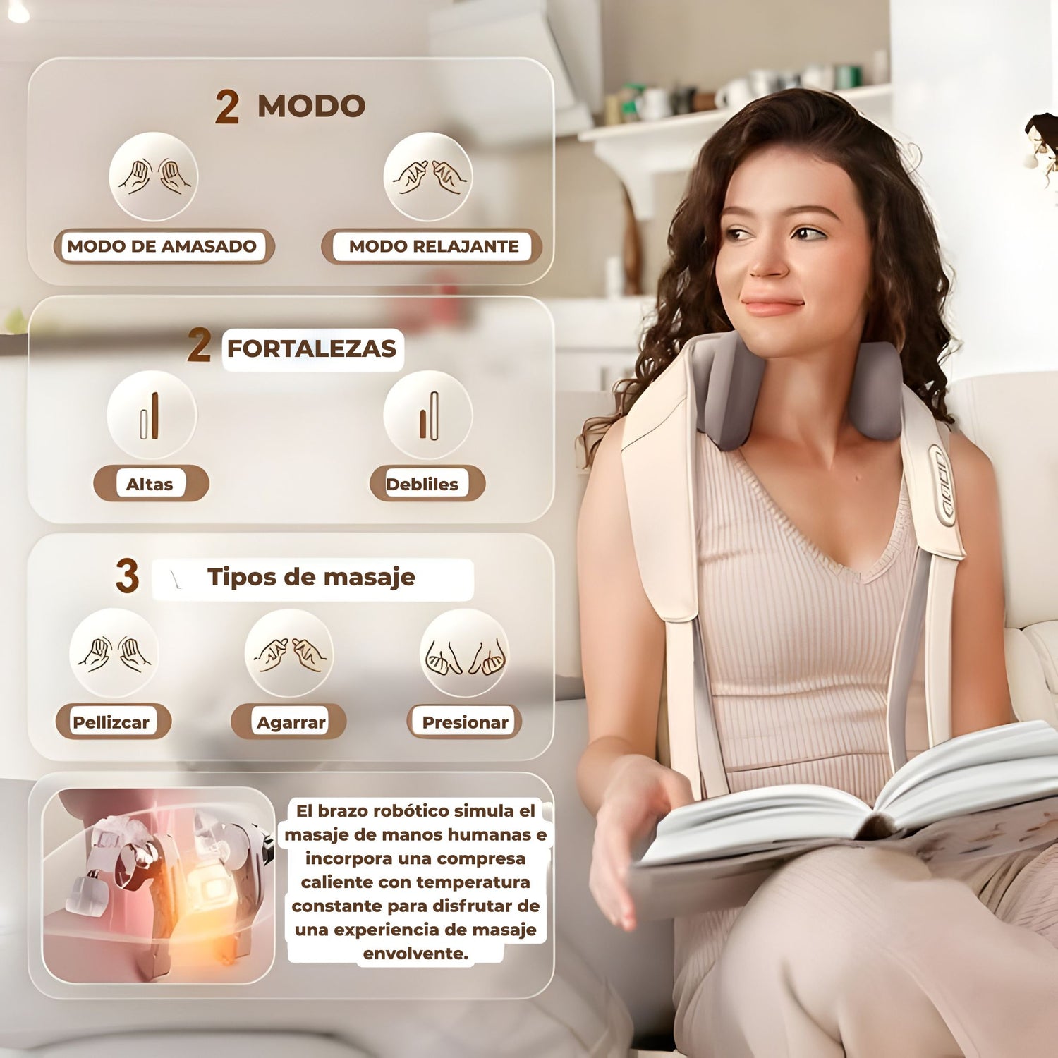 Alivio profundo del dolor cervical y trapezoidal, reducción del estrés acumulado, relajación muscular sostenida, uso manos libres en cualquier momento, batería duradera para llevarlo contigo a donde vayas, dos modos de masaje para personalizar la intensidad y una sensación de bienestar que mejora tu descanso y tu estado de ánimo.